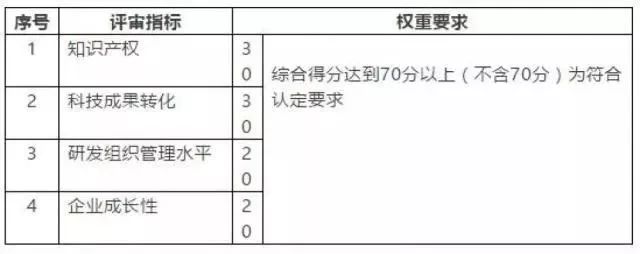 企業(yè)創(chuàng)新能力主要從知識(shí)產(chǎn)權(quán)、科技成果轉(zhuǎn)化能力、研究開發(fā)組織管理水平、企業(yè)成長(zhǎng)性等四項(xiàng)指標(biāo)進(jìn)行評(píng)價(jià)。各級(jí)指標(biāo)均按整數(shù)打分,滿分為100分,綜合得分達(dá)到70分以上(不含70分)為符合認(rèn)定要求。四項(xiàng)指標(biāo)分值結(jié)構(gòu)詳見下表: