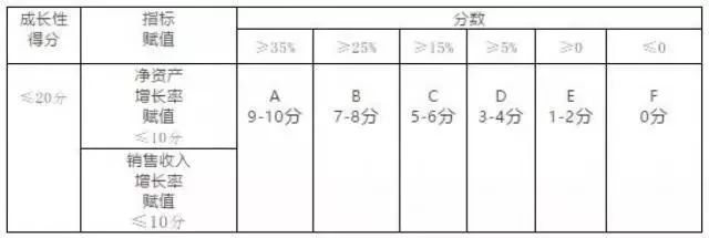 以上兩個(gè)指標(biāo)分別對(duì)照下表評(píng)價(jià)檔次(ABCDEF)得出分值,兩項(xiàng)得分相加計(jì)算出企業(yè)成長(zhǎng)性指標(biāo)綜合得分。